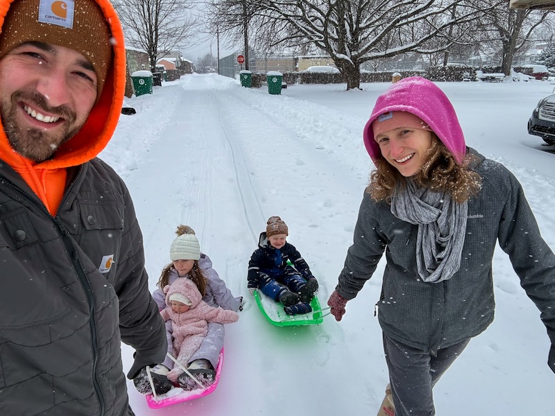 Mom and dad pulling kids on a sled in the snow