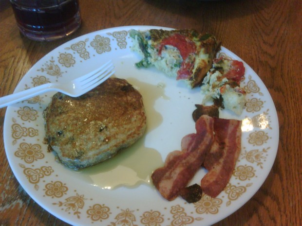 After I baked the quiche mom cooked up some turkey bacon and I made some homemade whole wheat blueberry pancakes. All of this paired with maple syrup tapped from New York. Yum.