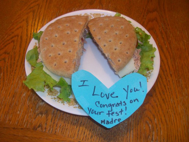 Thanks, mom! Just what I needed: Energy and encouragement in the form of a tuna sandwich and sweet note! I gobbled that up! I wish I could have my mom cook for me forever sometimes. I love her food. I am one lucky gal!
