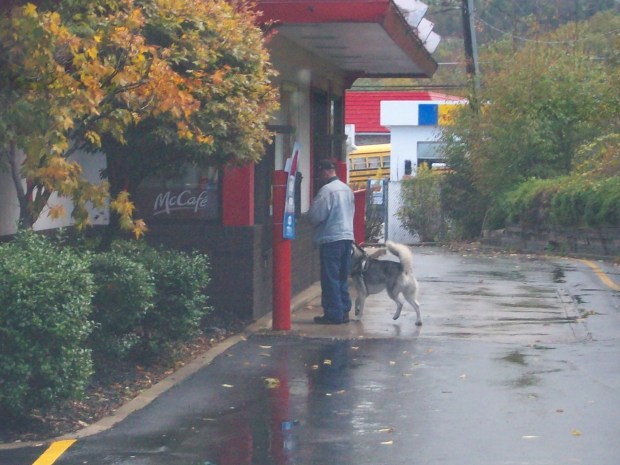 A man and his dog buying mcdonalds w/o a car! LOL.