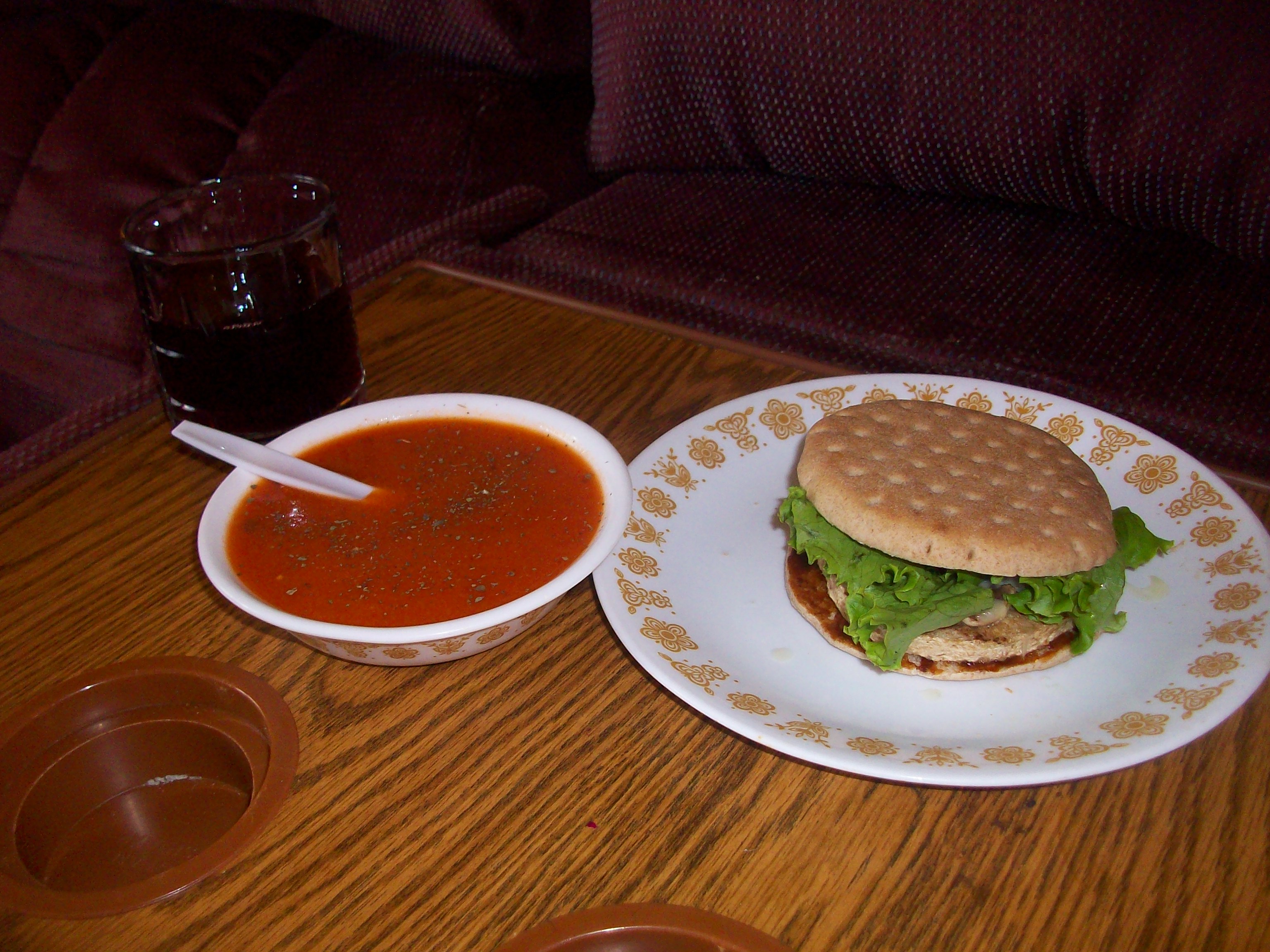 I added some lettuce, tomato, bread (of course!), and bbq sauce (YUM) and called it a lunch. + Tomato soup with basil and grape juice!