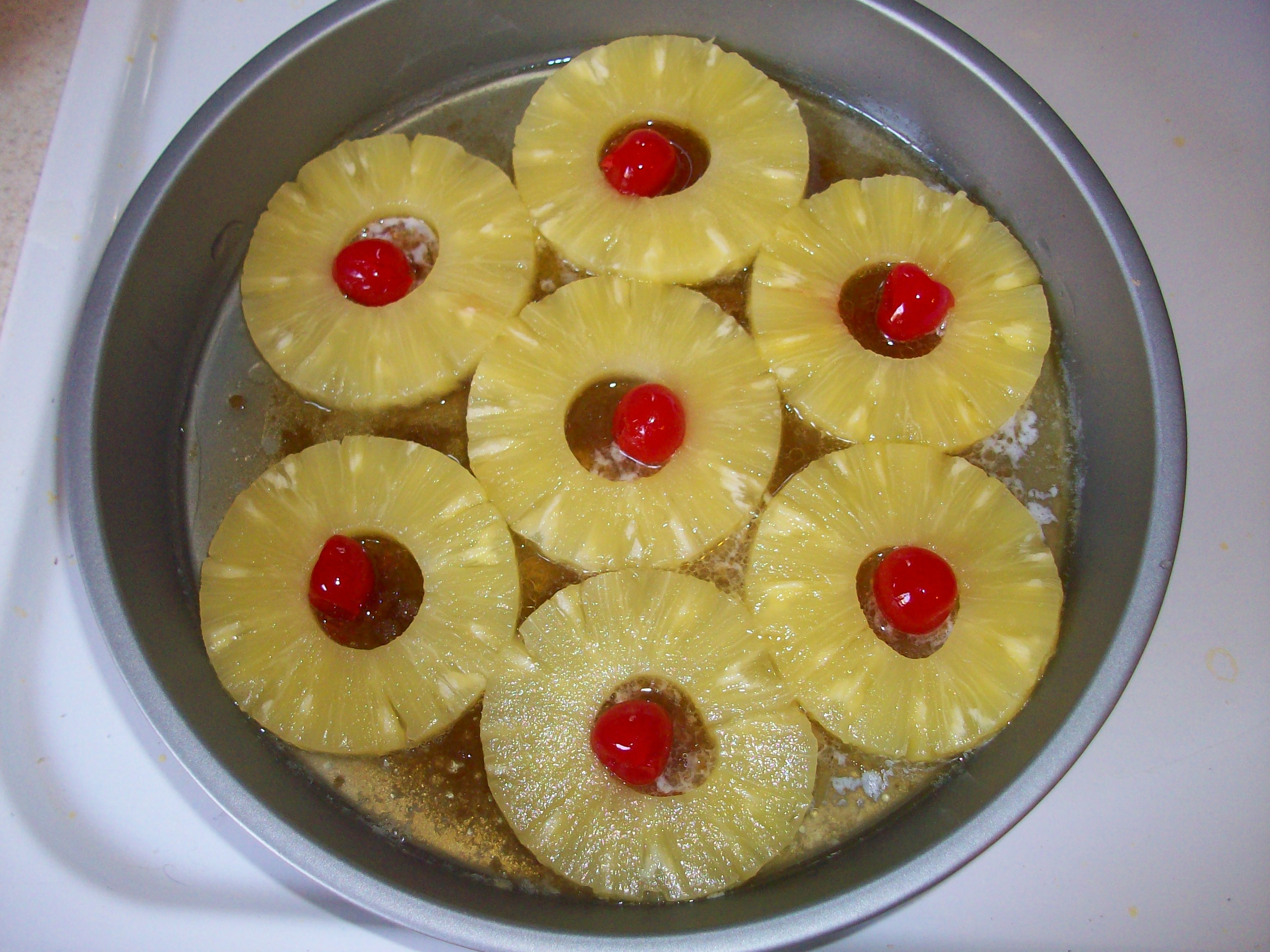 Butter, brown sugar, pineapple, and cherries.