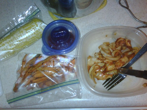 Bbq chicken with onions, SWEET POTATO FRIES with ketchup, and corn on the cob. Okay, this corn was frozen and then boiled. It was the best corn I ever had. It must have been picked at it’s peak! Yuuuum.
