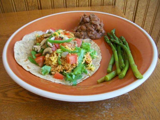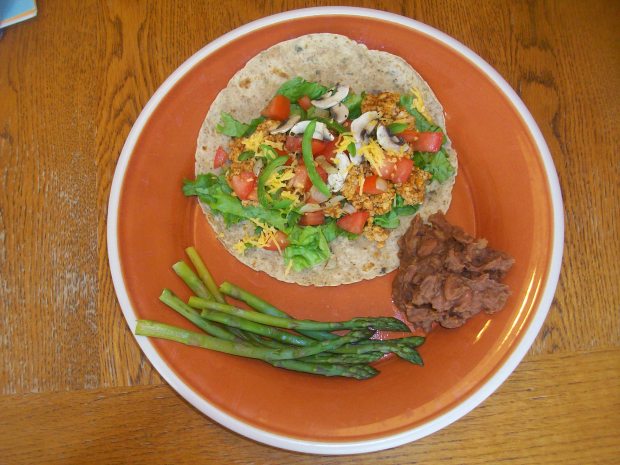 A taco with lots of lettuce, mushrooms, green peppers, tomatoes, onion, and cheese. Plus asparagus. Plus refried beans. I LOVE REFRIED BEANS 🙂