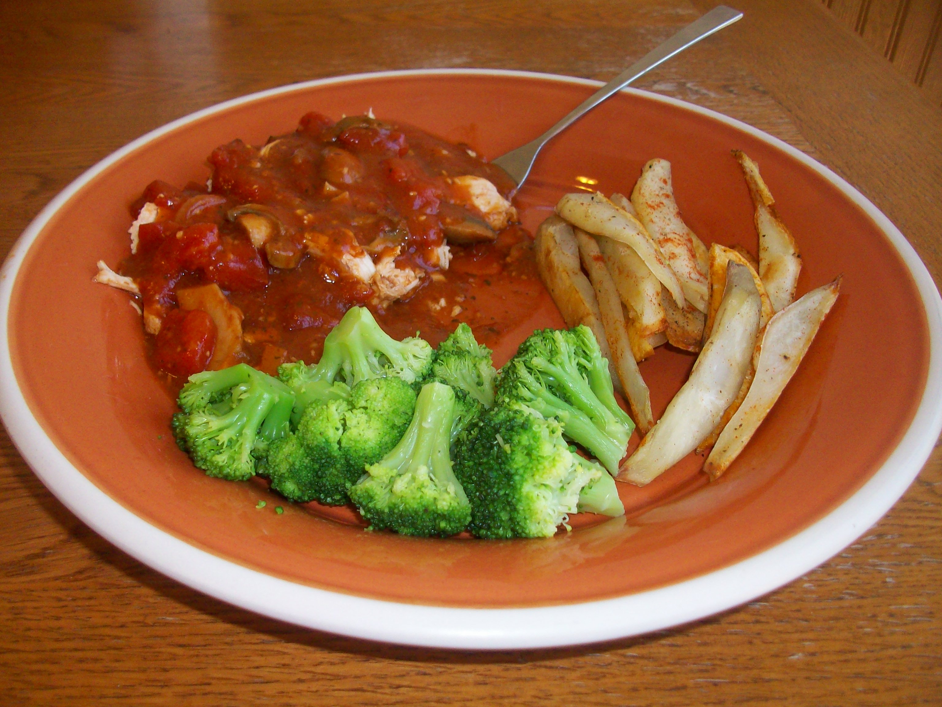 Dinner on Wednesday was delicious. It was slow cooked chicken. 3 Chicken breasts boiled in pasta sauce with mushrooms and green peppers. I expected the chicken to be dry. Nooo way! It was fall off the bone soft and juicy! Mmmmmm. You know how pulled pork looks? When I cut this chicken, it looked like pulled pork 🙂