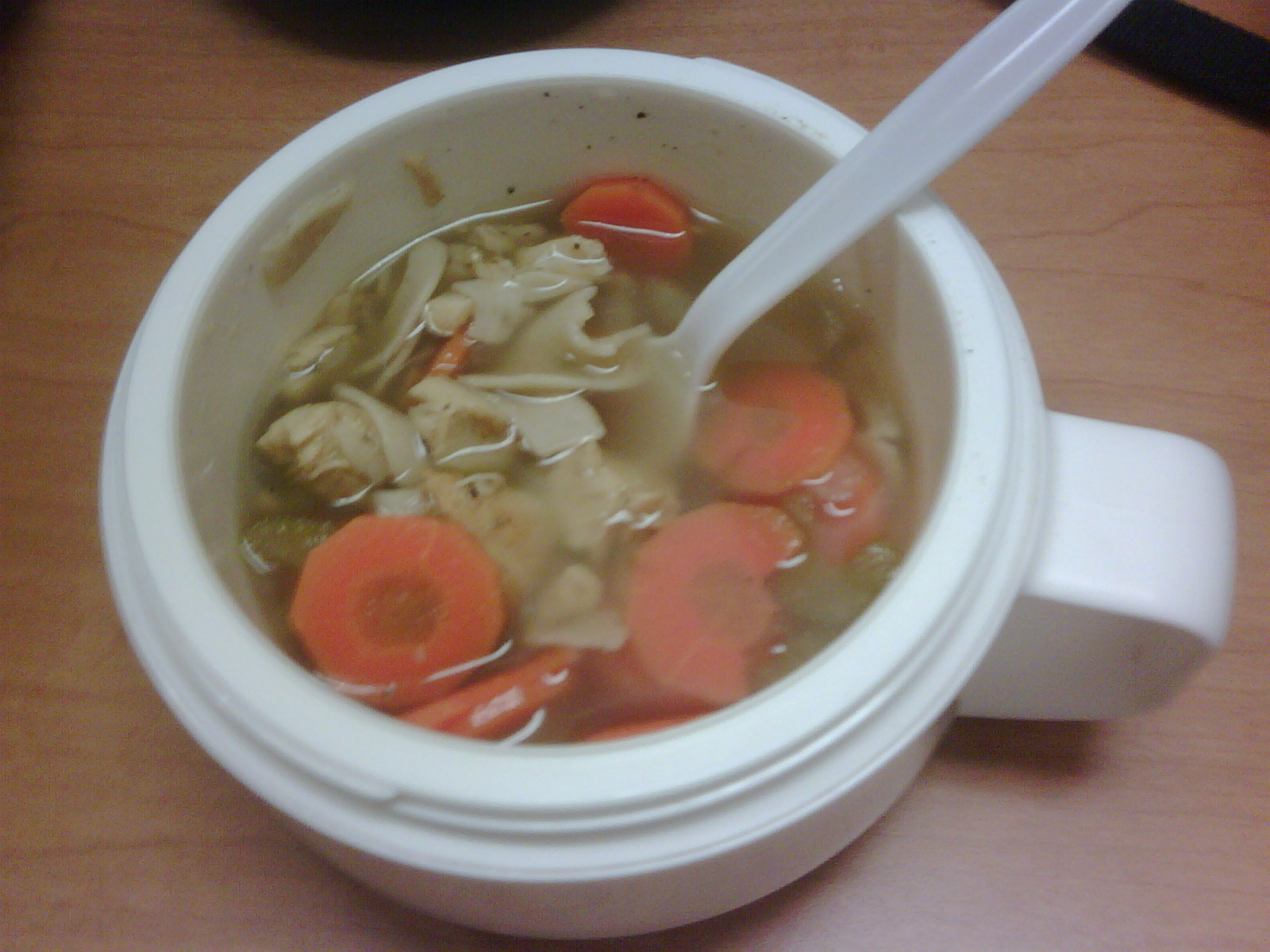It is finally soup season! I adore soup 🙂 In July my sister and I always ask my mom to make chili and she always says no because it is too hot outside. My mom is making chili tonight! SCORE. Who doesn’t love their mom’s home cooking??! This is her homemade chicken noodle soup that I enjoyed at school on Friday (before I was deathly ill like I am right now… I could use some homemade soup….)