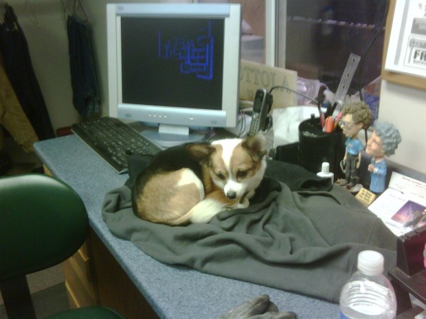 Little Tobi at work! This is Jimmy’s dog and she is so cute and yappy and always happy to see everyone! Jim’s papa likes to take Tobi to work at their shop sometimes. I worked on Saturday and there she was all curled up on Jimmy’s desk. Adorable 🙂