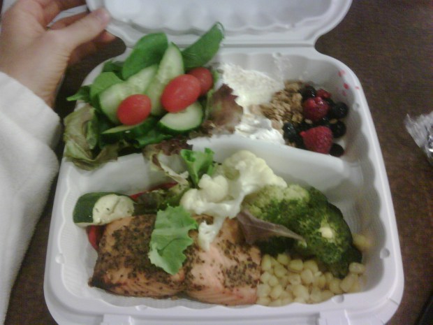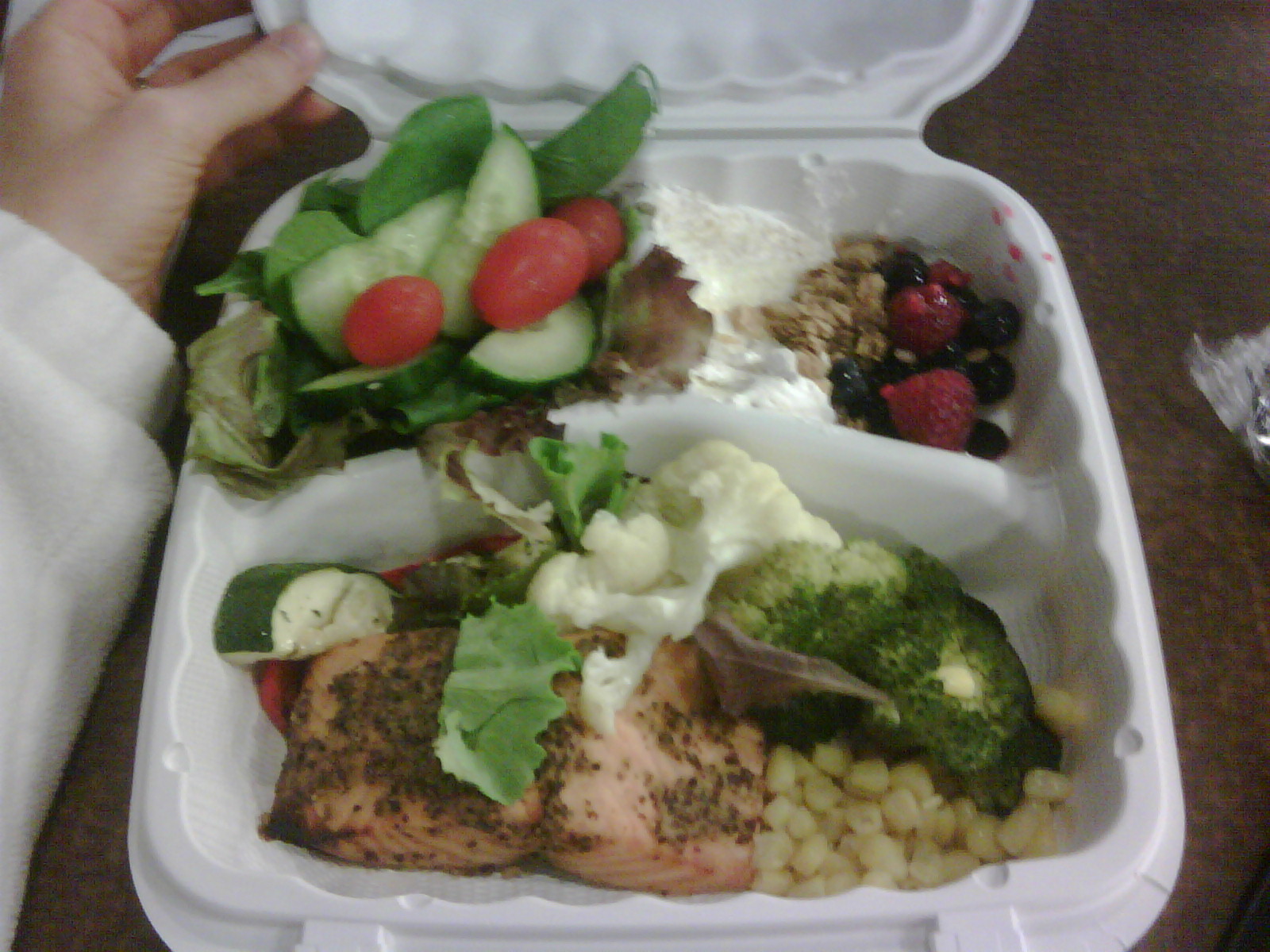 Dinner = Dill salmon, corn, broccoli, cauliflower, salad, stir fry veggies, vegetable soup, berries + granola + yogurt, and a PUMPKIN PIE PARFAIT! I head butted my boyfriend because I was so excited… 🙂 It was sooooo gooooood!!!!
