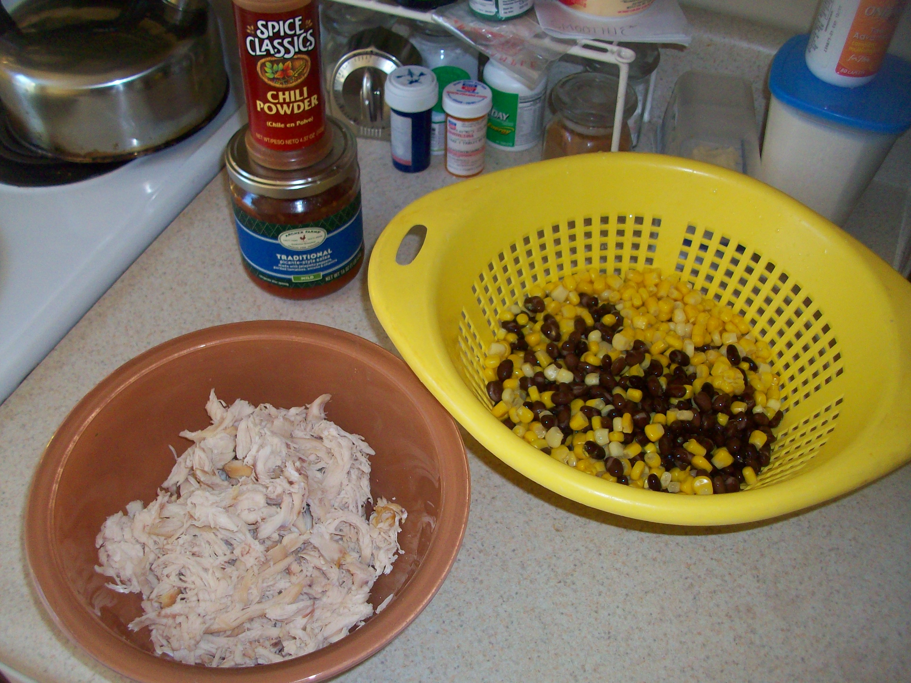 2 Cups of chopped rotisserie chicken + 1 can of corn + 1 can of black beans + 1 cup of salsa = yum.  Heat it up in the microwave for 2 minutes and add some cheese (yes.. I am addicted to cheese) and you’re good to go, man!