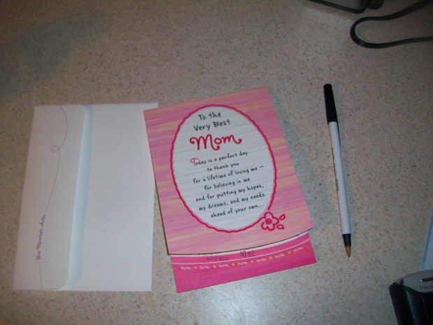 I gave my momma a card because she cared for me this week when I had a rash all over my whole body and it hurt. What a champ! Thanks mommy 🙂 She deserves a lot more than a card.