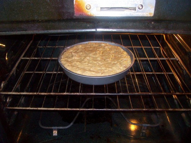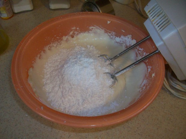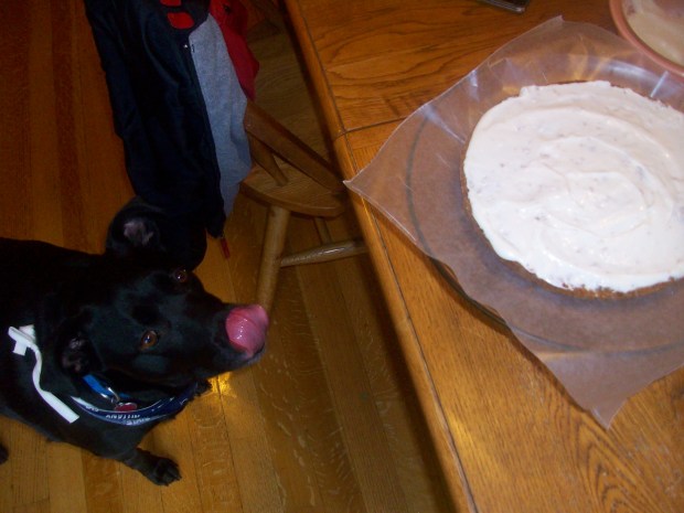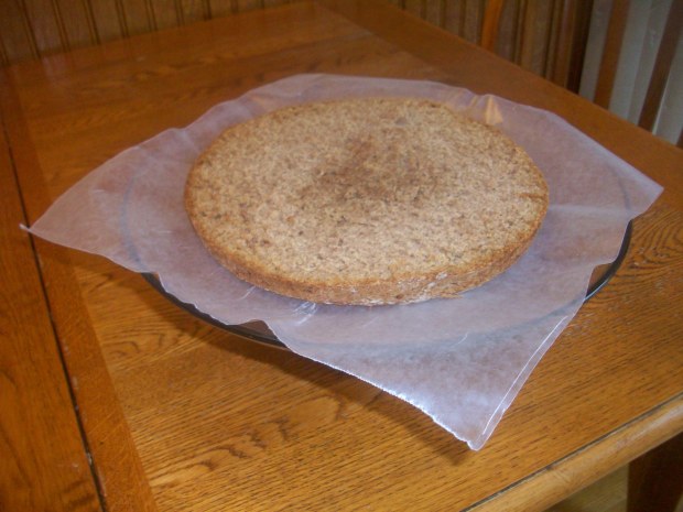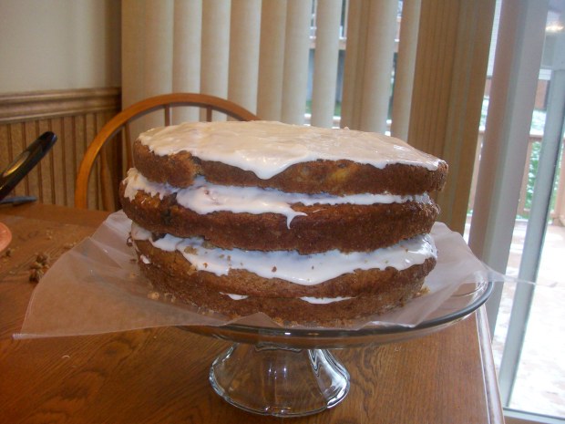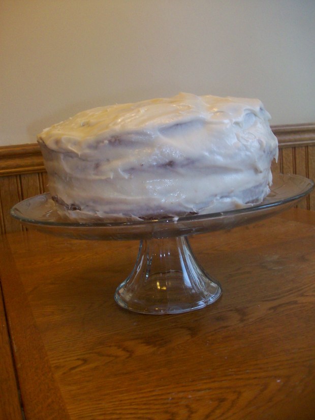 You make two 9-inch cake pans worth of batter. Cut each in half and start to frost! Above is layer #1 of 4)