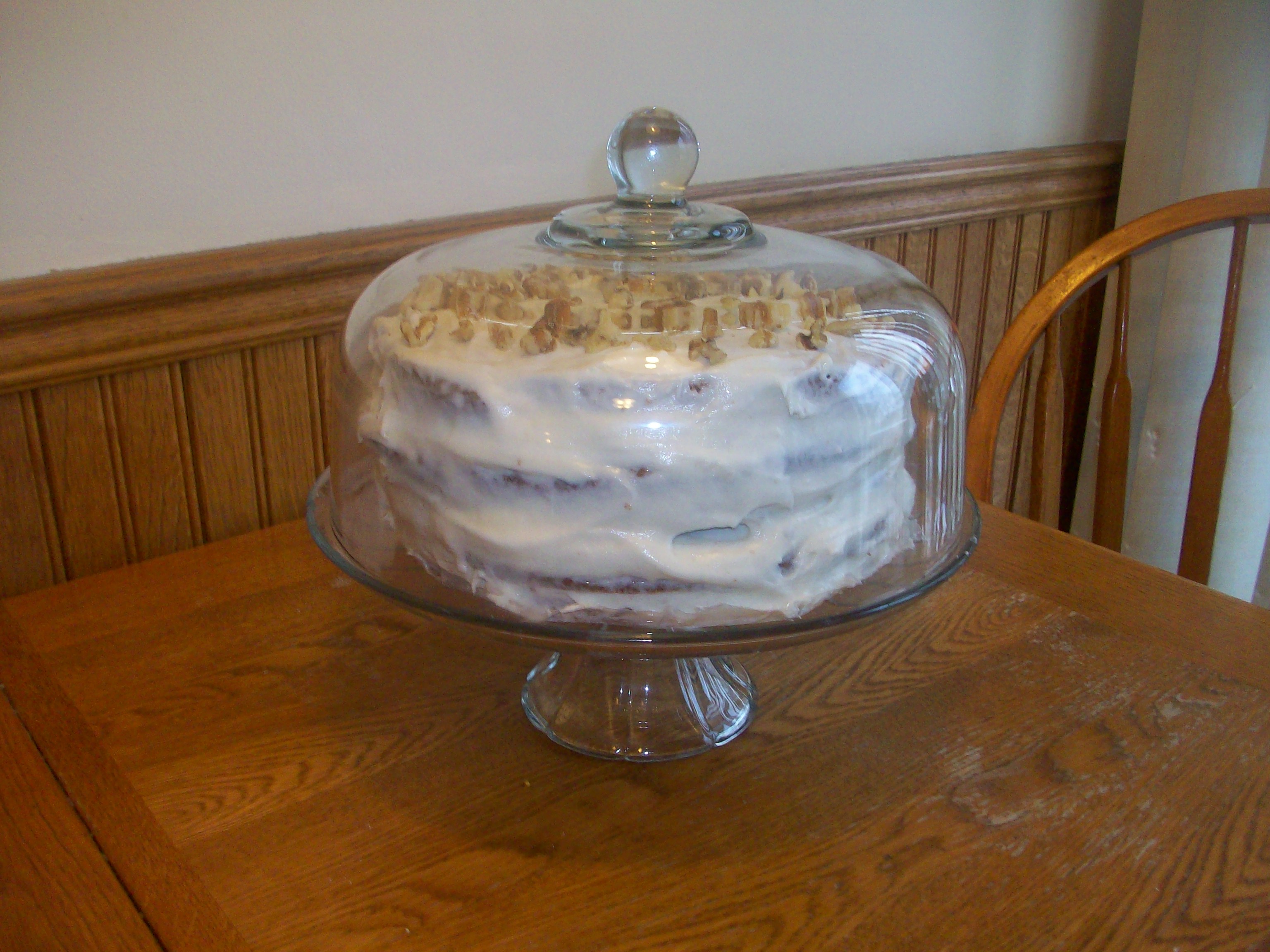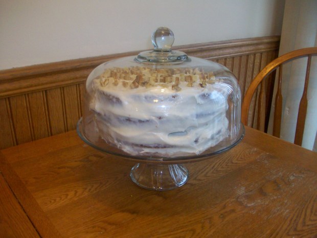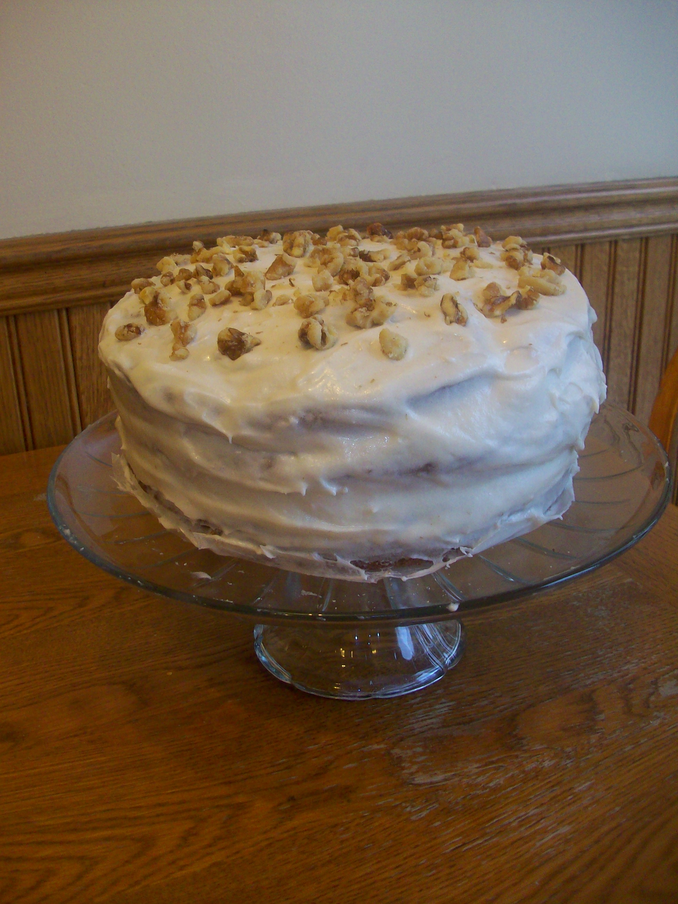 It is frosted with cream cheese frosting and then topped with more nuts!