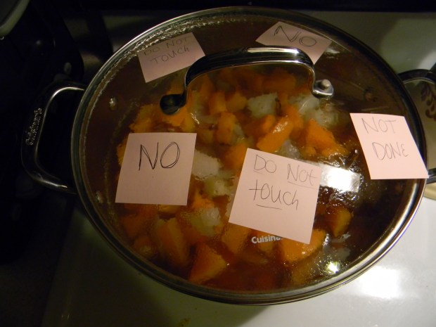 Butternut squash soup… that I didn’t want my dad to touch.. because it wasn’t done. Sometimes he ignore post it notes… so I used 5 post it notes !