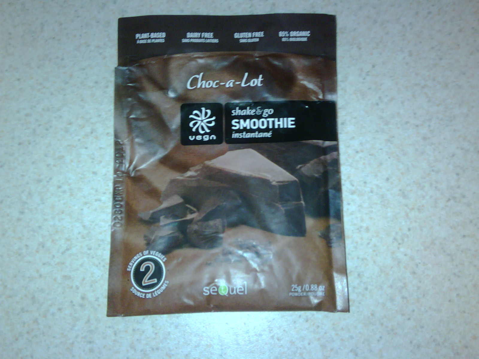 ^ Smoothie mix from Whole Foods. It was $2.49 but Jimmy found a dollar on the ground so it was actually like $1.49 😉 Anyways, the smoothie mix was very chocolately and it said to mix it with water, but I mixed it with soymilk and it was good, except a little chunky!