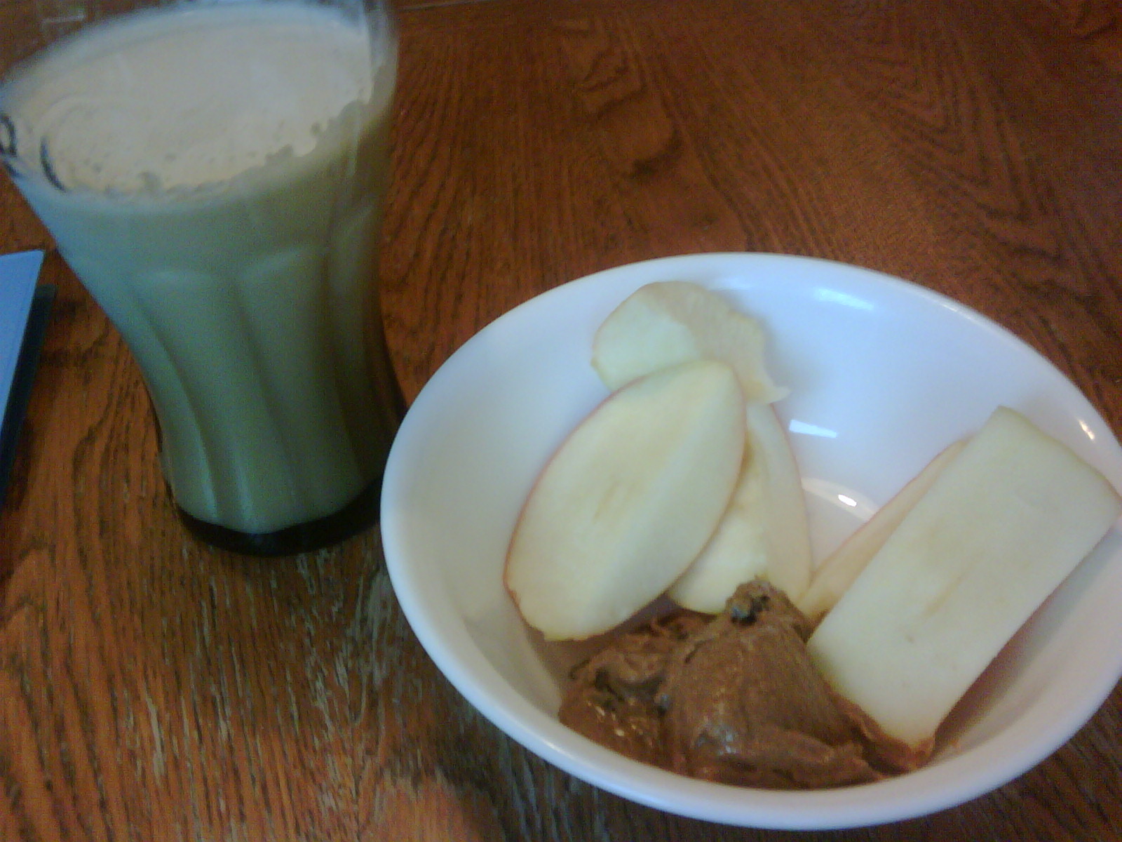 Post shoulders/bicep workout snack: Vanilla protein shake + apple w/ cinna raisin pb