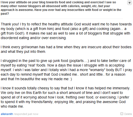 4. I think to not have a twisted relationship with food and/or exercise is a rarity, not only in the blog world but in our society overall. I struggle with self-confidence and perfectionism in school and work, but thankfully I’ve never had those issues overlap into my eating or anything like that. I credit a lot of it to my parents, who never emphasized weight/dieting. My body is not perfect, but there are way more things I love about it than things that I dislike. And there is so much more to our bodies that their appearance.