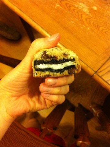 My little sister brought this gem home on Friday. It is a Oreo baked into a chocolate chip cookie! This blew my mind hahaha.