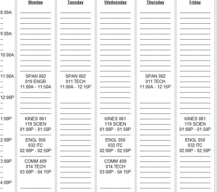 For the spring semester I scheduled kinesiology, creative writing, an online writing for the web course, Spanish II, and a communications course.