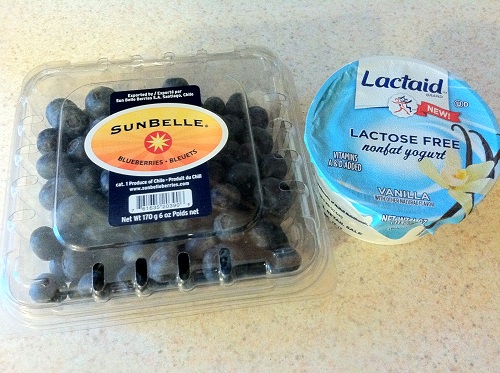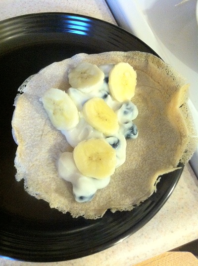 3. For filling: Set aside a few blueberries and banana slices to top the crepes with. In a medium bowl mix together yogurt, blueberries, and bananas.