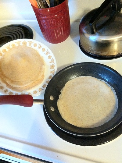 2. Pour batter into pan an immediately swirl the pan to make a thin layer. Cook until top of crepe looks dry-about 1 minute. Place crepes on a plate with a sheet of wax paper in between each crepe.