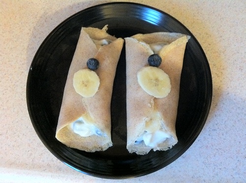 4. Fill crepes with about 1/2 cup of filling and garnish with blueberries and banana slices that were set aside.