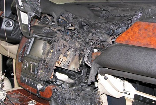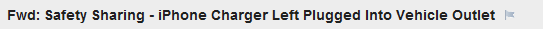 A family left their iPhone charger plugged into their vehicle outlet. The outlet overheated and started a fire while parked in their garage. The family was safe because the fire started around 11pm, right before they went to bed, and it didn’t spread to the house.