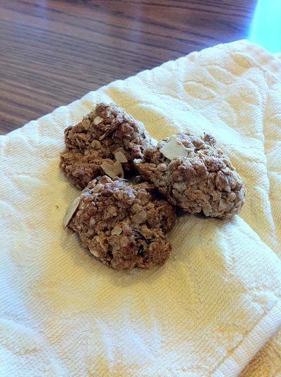 - Combine the oats, flour, cinnamon, baking powder, baking soda, salt, raisins, and almonds in a large bowl. In a separate bowl, combine the syrup, oil, vanilla extract, and molasses. Add the wet ingredients to the dry ingredients, and stir to combine.