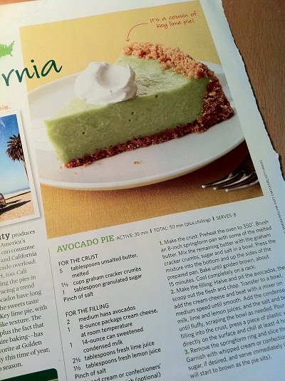 - My brother LOVES avocados and I found a great recipe for him in an old Food Network magazine… avocado pie. I mailed it to him today and I’m totally wondering if he’s going to make it!