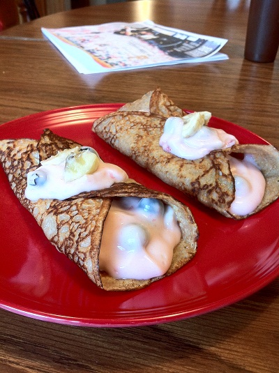 Crepes with strawberry yogurt, blueberries, and bananas.
