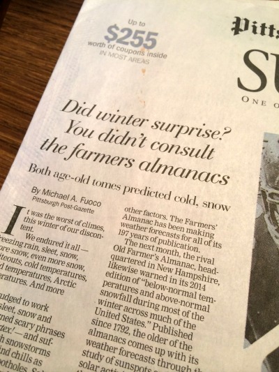 3. The Farmer’s Almanac is usually correct. In a 2011 post I described my love for the Farmer’s Almanac and its accuracy at the ripe age of 18 haha. Well, I opened the Pittsburgh Post Gazette the other day and found this article