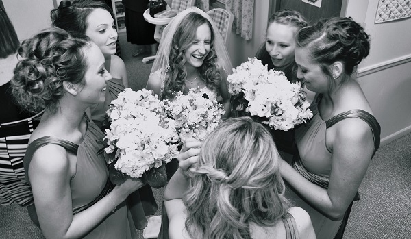 My bridesmaids all wore their hair however they wanted and wore sandals, too. We were laughing so hard in these pictures because the photographer told us to sniff our flowers and we were all looking at each other over our flowers awkwardly. Good times :).