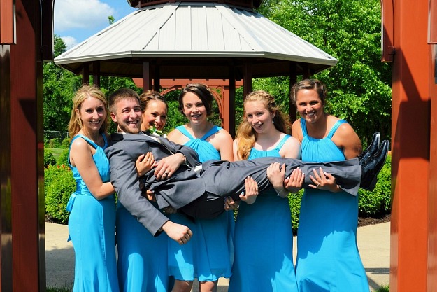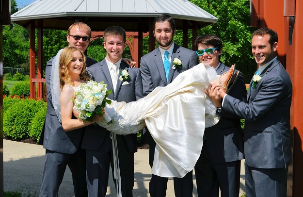 One of our groomsmen, Brett, was standing with us outside the church with us after the ceremony. He was wearing some awesome sunglasses, and I don’t know what prompted me to ask him if I could wear them… but I did. Then the photographer snapped away. When we went to the park, she was like “Put on Brett’s sunglasses for this picture!!” about ten different times haha. When Jimmy and I got our wedding pictures, we were cracking up at all the random ones with me wearing Brett’s sunglasses. I feel so bad I stole his shades!