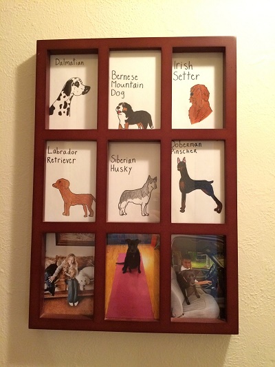 I’ve been working on a little art project. I had the above picture frame filled with “real life” dog pictures, mostly of Lola, Brandy, and Moses. I thought it would be fun to draw pictures of some of my favorite dog breeds and put them in the picture frame. Poor Jimmy. He came home from work one day and was cracking up. It makes me smile every time I see it. I just need to finish the last three pictures!