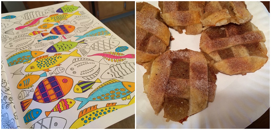 I love coloring, and I bought an adult coloring book over the summer. I totally got my sister-in-law into it, and she got my mother-in-law into it, too. So, we had a girls’ night of coloring and baking caramel apple pie cookies, which were superb.