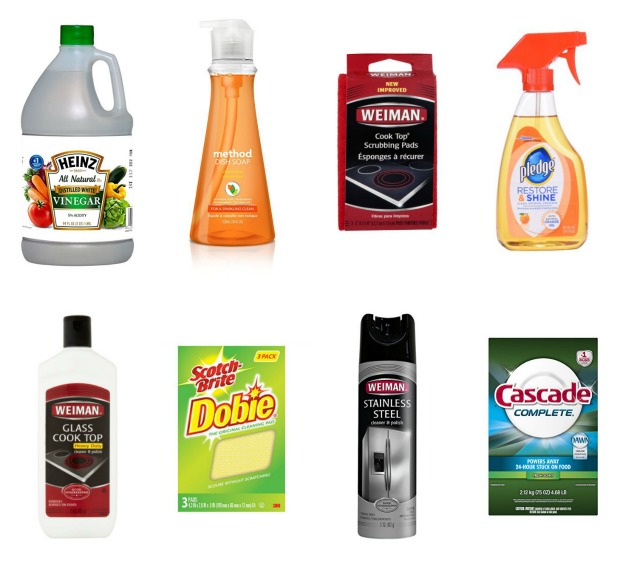 Heinz White Vinegar // Method Gel Dish Pump // Weiman Cook Top Scrubbing Pads // Pledge Revitalizing Furniture Oil Spray // Weiman Glass Cook Top Cleaner & Polish // Scotch-Brite Dobie All-Purpose Cleaning Pads // Weiman Stainless Steel Cleaner & Polish // Cascade Complete Dishwasher Detergent