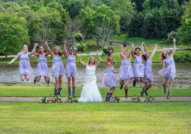 Bride and groom with flowersBridesmaids jumpingOutdoor wedding pictures