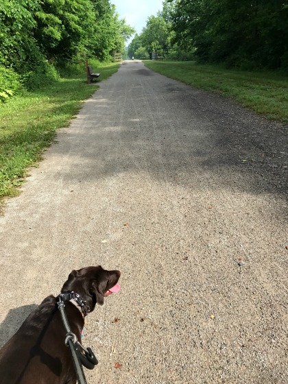 Trail walk with chocolate lab