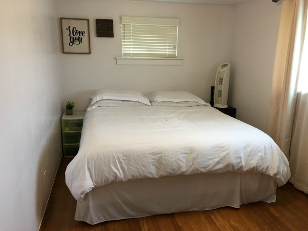 Up next, I’d like to hang a picture ledge I bought from Target, buy a bench to go in front of the bed, get some colorful throw pillows, and hang a mirror!