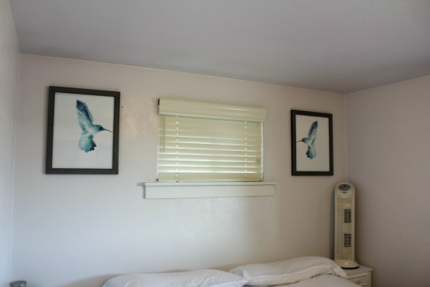 I hunkered down a little more on this project and here’s what our room looks like now with the addition of gray curtains, hummingbird watercolor prints, and new nightstands.