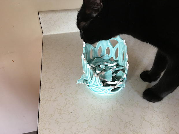 I was in our basement doing laundry the other day while Malcolm and Mavis were upstairs playing. I heard a big crash and found the shattered vase all over the floor. I’m pretty sure Mavis may have ate some of it, too. I’m happy to report she’s alive, though!