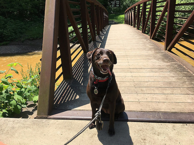 Chocolate lab on bridge by water in Pittsburgh Panhandle Trail by Walkers Mill in Rennerdale PA Pittsburgh