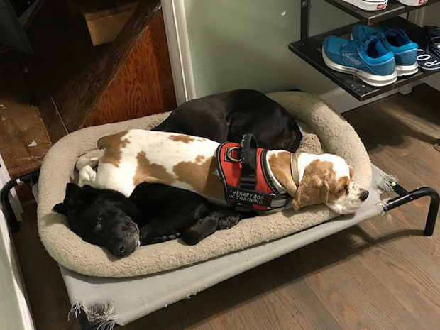 Black cat laying in windowsillCocker spaniel laying on black lab funny