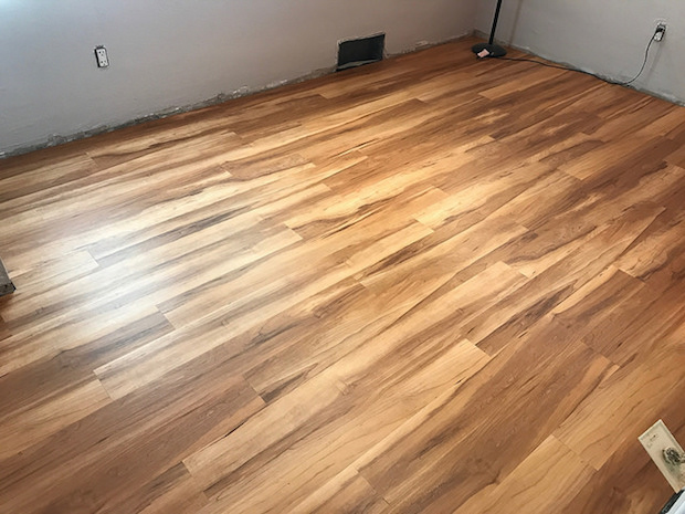 Jimmy also installed new flooring! We have hardwood floors in our home, but they’re pretty beat and we didn’t feel like resurfacing and staining them (been there, done that), so we bought interlocking vinyl flooring to put on top of the hardwood.