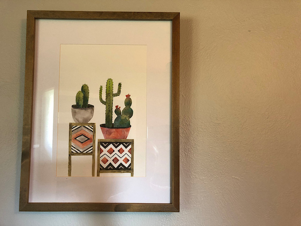Last but not least, we have the door, new ceiling fan, and some artwork! The door was 100% Jimmy’s idea (as was painting the ceiling; he’s so creative!) and I think it looks great. The cacti watercolor is actually something I’ve had for a few years now, back when I wanted to paint our office a peachy-coral color. It’s still one of my favorite pieces of artwork in our house.