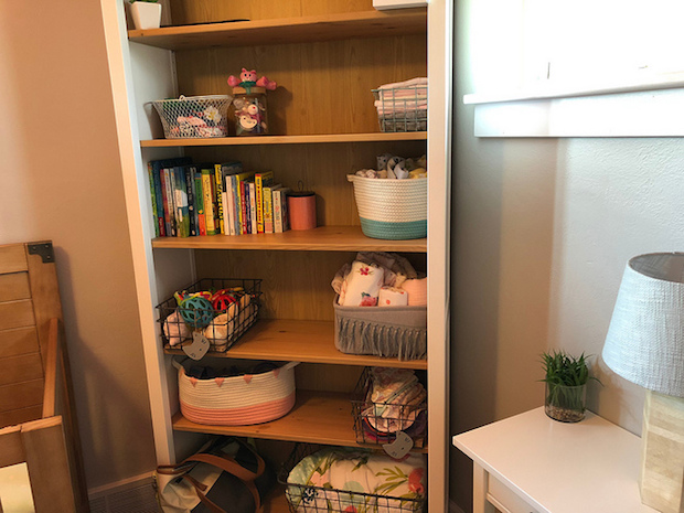 Baby girl’s bookshelf is stocked with a random assortment of toys, blankets, books, bibs, swaddles, pacifiers, headbands, burp cloths, a play mat, and her diaper bag. We kept her toys up a few shelves because the pets are very interested in her rattles and balls!