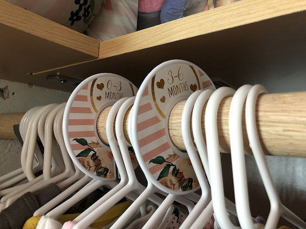 Baby girl nursery closetBaby girl closet with clothes and wood barsBaby girl nursery closet clothing dividers