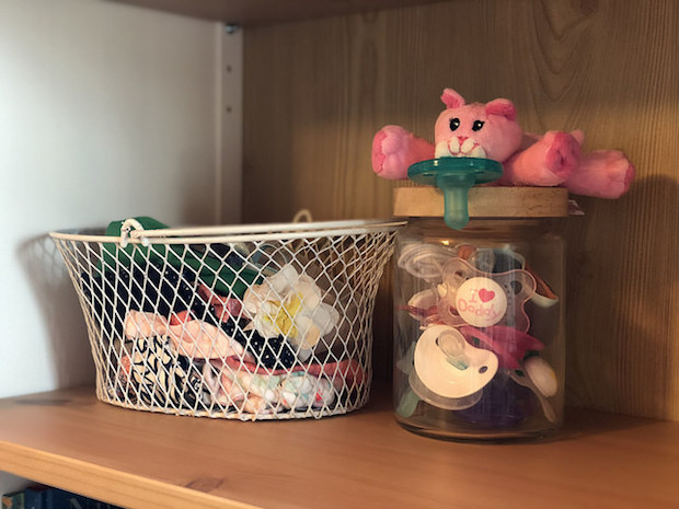 Baby girl bookshelf in nursery from IkeaBaby girl pacifiers and headbandsBaby girl nursery bookshelf from Ikea with fabric and steel baskets