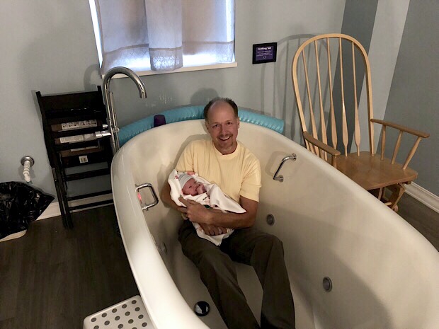 My father-in-law with Sadie in the tub I wanted to labor and deliver in, lol!