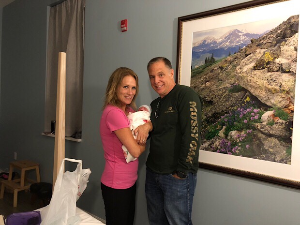 She had Jimmy hold an oxygen mask over my face and told me that I could deliver Sadie at the birth center or in an ambulance on the way to the hospital. My body had been bearing down since I was in the truck, so I had no problem pushing. At one point, I looked over and saw the paramedics in the doorway, but I was so close to delivering that they didn’t have to transport us. With a few more pushes, Sadie entered the world at 1:59 AM weighing seven pounds and three ounces.
