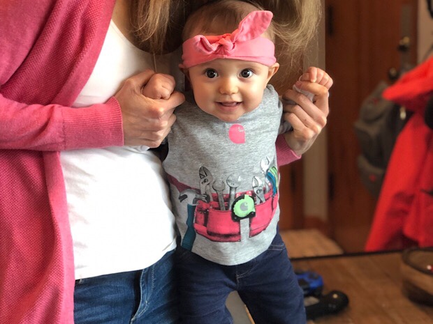 Current cuteness Sadie in a Carhartt shirt! Jimmy wears a lot of Carhartt gear at work, so we thought it would be cute to get her a tool belt t-shirt so she can dress like her dad.